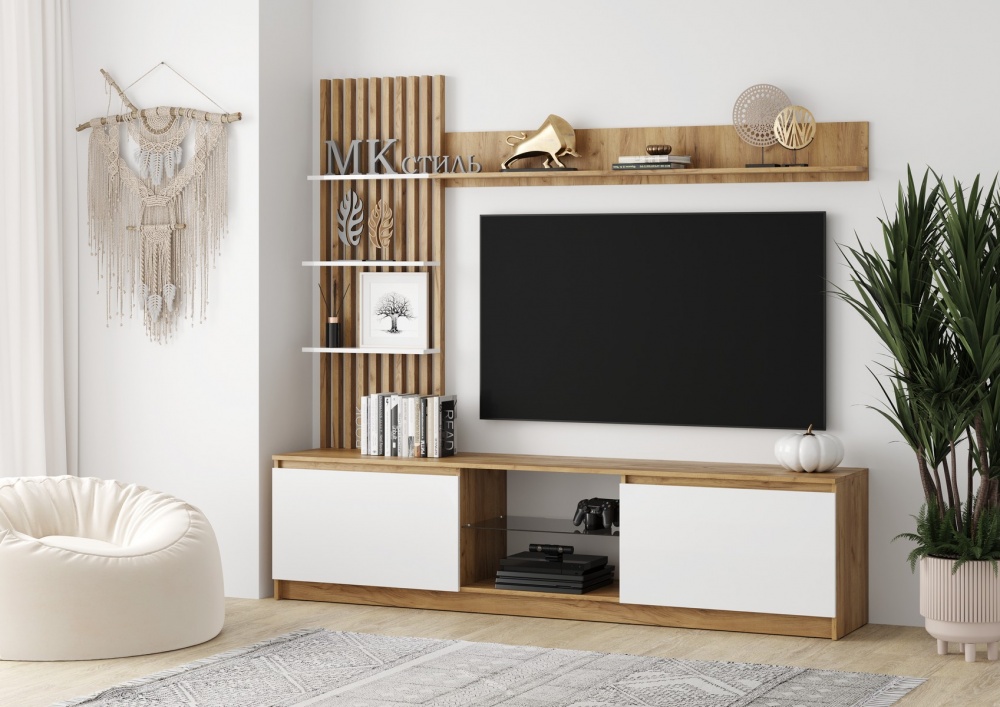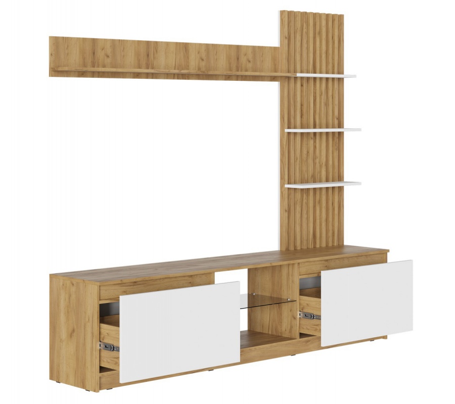Два выдвижных ящика на направляющих полного выдвижения, направляющие выдерживают нагрузку до 45 килограмм. Ящики не имеют ручек, открывание происходит за фасад с помощью специальных зазоров. Ниша под телевизором оборудована стеклополкой из тонированного стекла в цвете Графит, края обработаны еврокромкой.