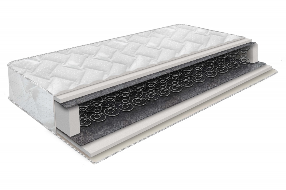 Основа данного матраса зависимый пружинный блок Боннель, с обеих сторон покрытый термоскрепленным войлоком и гипоаллергенной пеной ecofoam. Чехол матраса из эластичного полотна, стеганного на синтепоне. Основные достоинства данной модели - надежность в эксплуатации и доступная цена. Рекомендованная нагрузка до 100 кг на одно спальное место. Рекомендуется для дачи и гостевых спален.